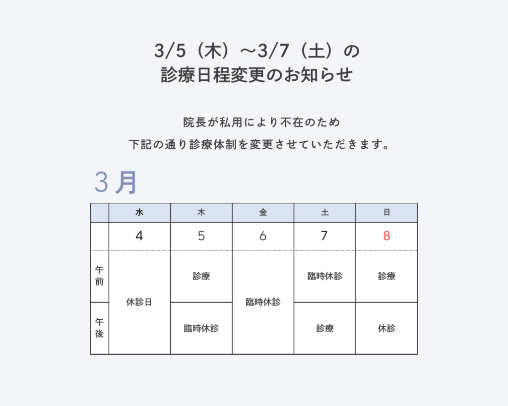 - 3月6日(金) :休診(※代診から休診へ変更となりました)