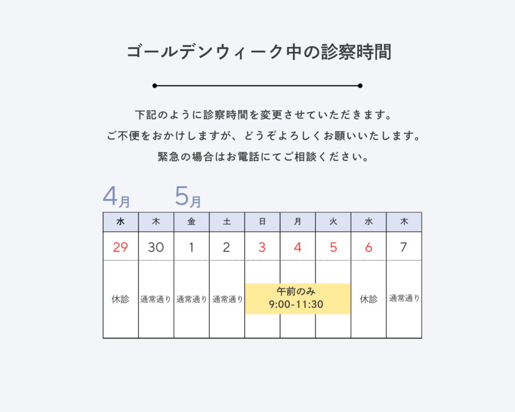 ゴールデンウィーク期間中の診療は、下記の通りとさせていただきます。